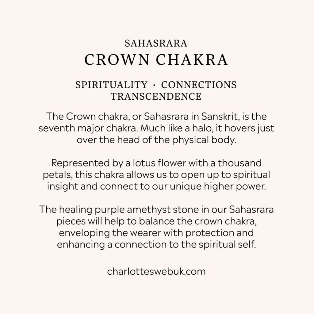 The Crown chakra, or Sahasrara in Sanskrit, is the seventh major chakra. Much like a halo, it hovers just over the head of the physical body. Represented by a lotus flower with a thousand petals, this chakra allows us to open up to spiritual insight and connect to our unique higher power. The healing purple amethyst stone in our Sahasrara jewellery will help to balance the crown chakra, enveloping the wearer with protection and enhancing a connection to the spiritual self.
