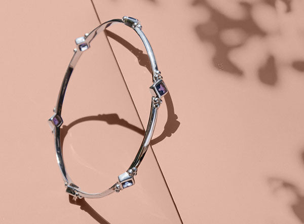 The spinning rings, stacking rings, bangles, and earrings in our Divinity Princess Collection harness the healing powers of gemstones and birthstones to guide you on your journey of life. Ethically handmade in small batches with recycled metals and conflict-free stones such as emerald, opal, blue topaz and iolite, this eco-jewellery belongs in every fair trade collection.