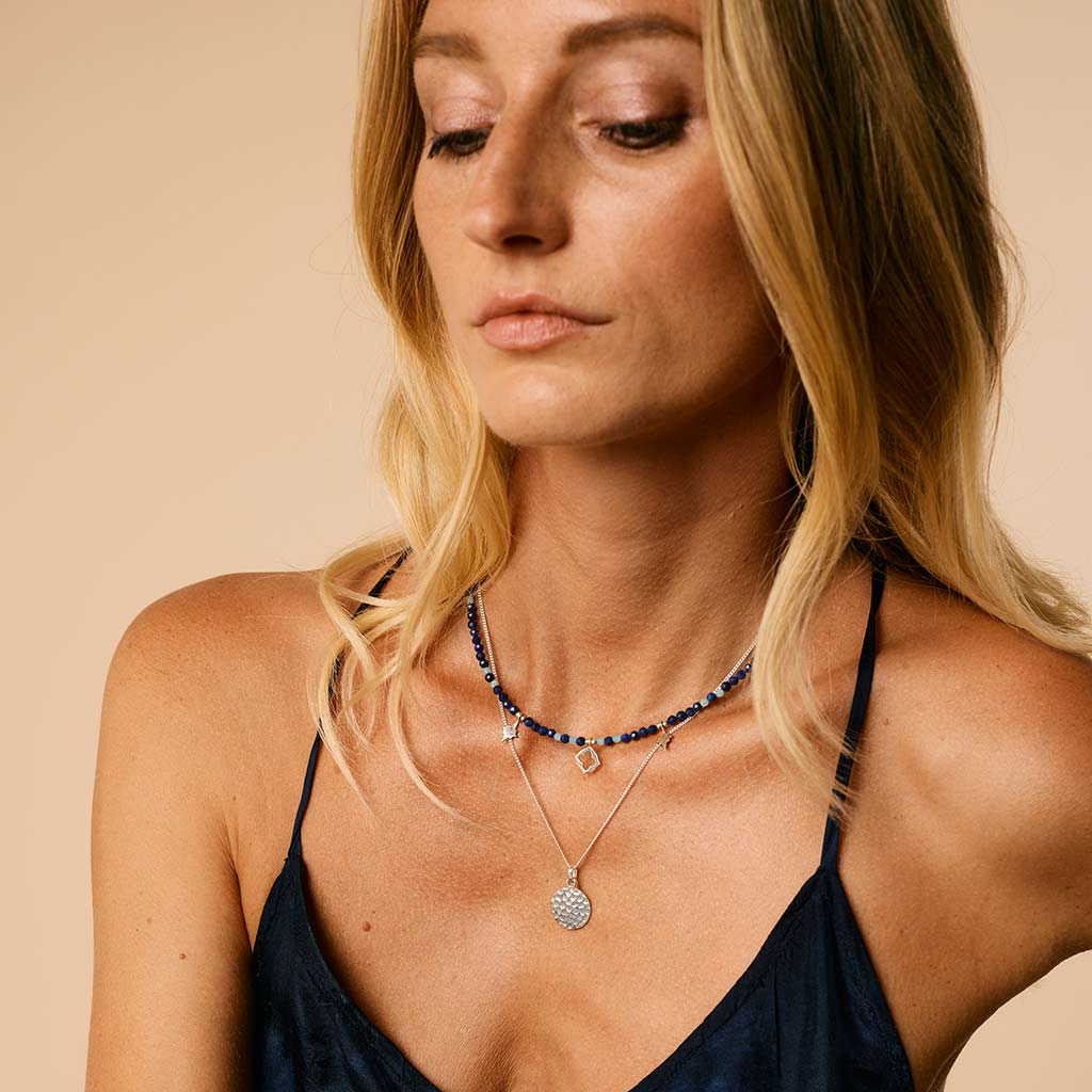 Find inner harmony with our stunning Essaouira Blues Necklace. Delicate blue gemstones, Lapis Lazuli and Apatite are combined with three delicate Moorish inspired silver charms to create this simple, yet elegant necklace. The deep blue of the Lapis Lazuli perfectly symbolises the hue of the world's most beautiful oceans.
