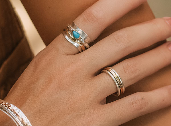 Handcrafted details and textures are a Charlotte’s Web signature, evident in our collection of ethically made spinning rings, stacking rings and toe rings. Our colourful, handpicked gemstones bringing rings to life, set in recycled silver, 24 carat gold plating, recycled brass and copper. We can also offer personalisation with gemstones of your choice.