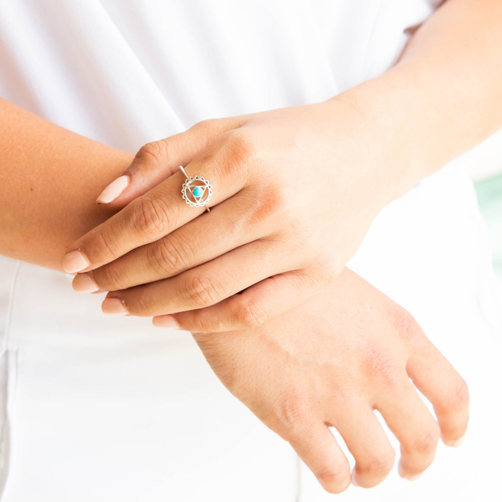 Vishudda, the throat chakra, is the chakra of communication. When open, your voice has a greater power and your words can be heard. The healing stone of turquoise is perfect for helping to open the throat chakra, it’s sea blue colour and gentle power encouraging your words and voice to flow like water. Wear this stunning chakra ring to enhance your Vishudda.