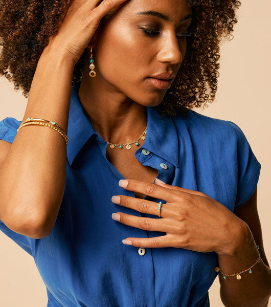 Our Lakshmi Jewellery Collection, inspired by the Hindu Goddess of abundance, shines with sustainable silver, gold vermeil, and fairly traded gemstones such as blue topaz, turquoise, opal, and lapis lazuli. Every piece is handmade in India and fully traceable from design to delivery. Find your perfect gemstone rings, bracelets, necklaces, anklets, and earrings in this stunning jewellery edit.