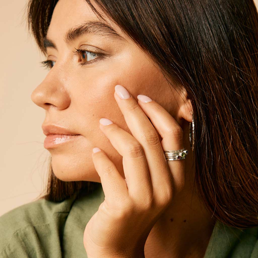 Ethically handmade to order, our Personalised Holi Prosperity Spinning Ring will fit seamlessly into your environmentally conscious lifestyle. You can customise this sustainable spinner ring, hand-cast in recycled silver, with three gemstones of your choice. Add your birthstone to make it yours.