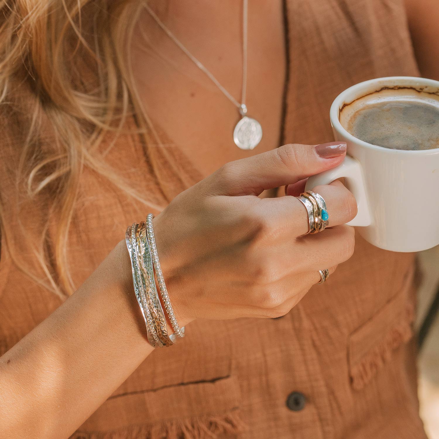 Spinning jewellery is a modern wonder inspired by ancient meditation techniques. Much like the Tibetan prayer wheels used by Buddhist monks for centuries, silver spinning rings spin to soothe the mind in times of stress. Spinning necklaces bring balance and good karma to the soul, while spinner bracelets calm fidgeting hands to instil a sense of well-being.