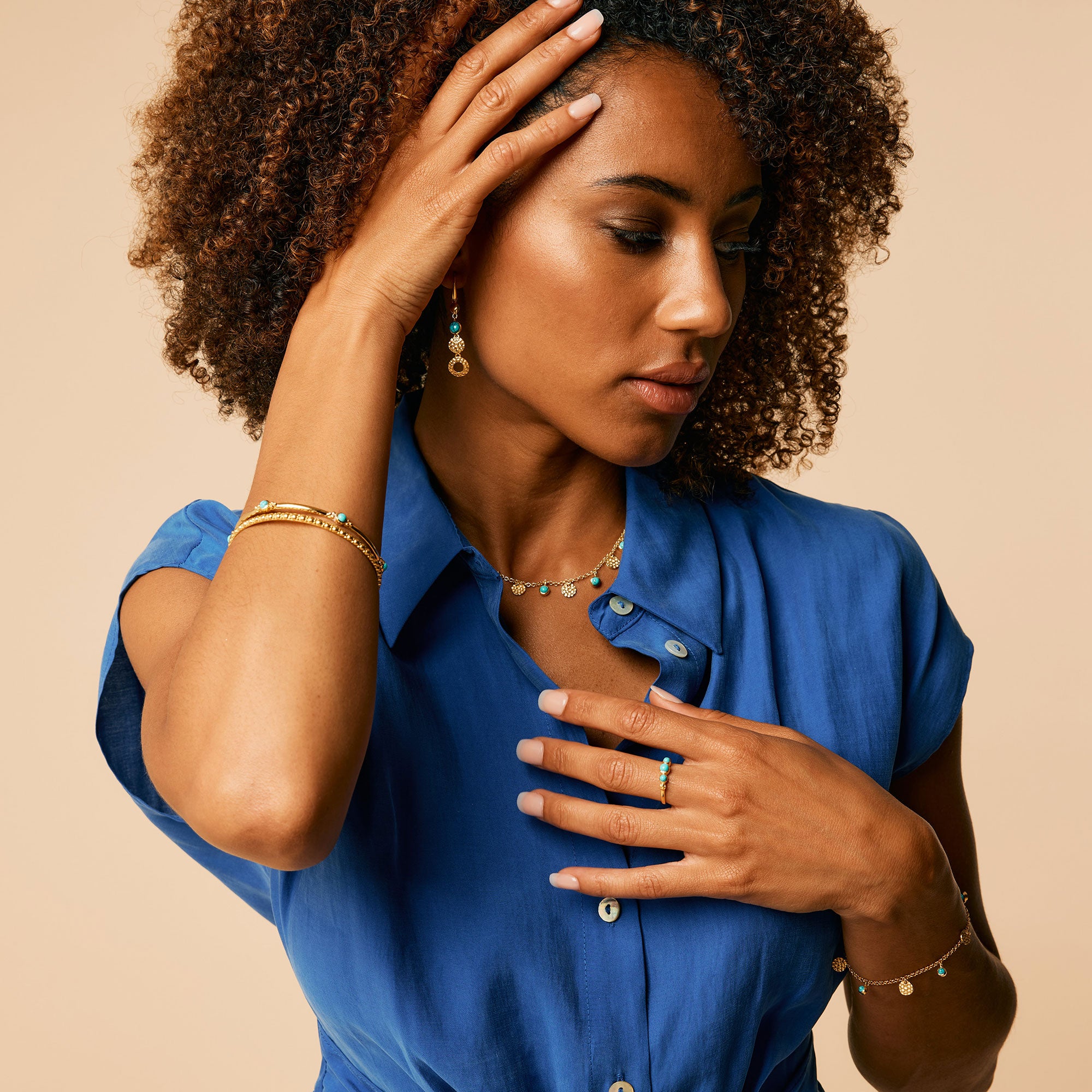 Consciously curated in sustainable gold vermeil, our Lakshmi Turquoise Ring brings a touch of Eastern charm to Western jewellery collections. Three ethically sourced turquoise gemstones lend colour and spiritual charm while shimmering gold adds instant glamour to this December birthstone ring.