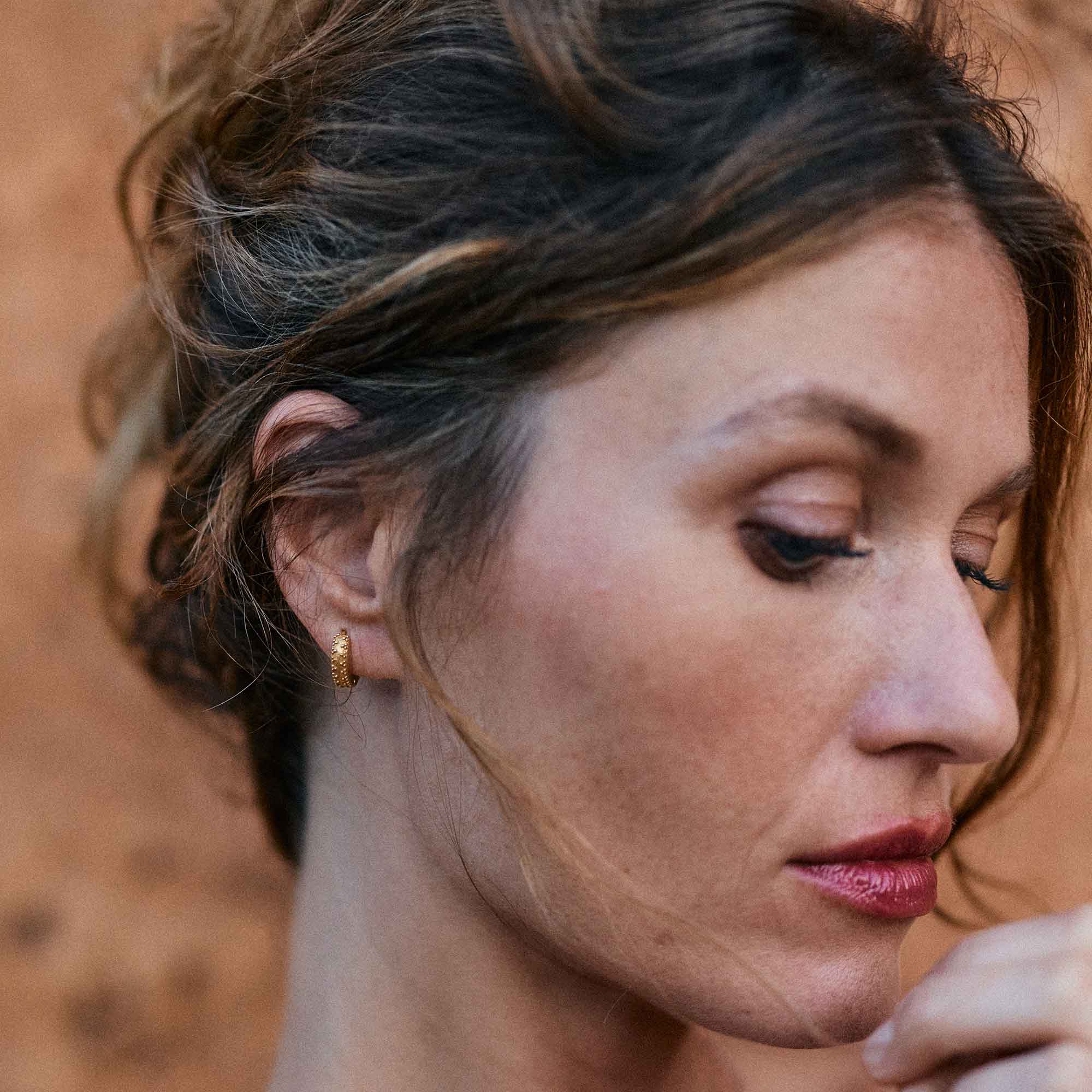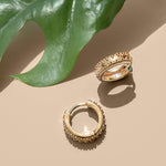 Our Rania Huggie Hoops in gold have been inspired by Indian nobility and handcrafted in India by skilled jewellers. these studded gold plated huggie hoop earrings have studded edges and are made from sustainably sourced gold. Designed to embody class and sophistication, the Rania hoops are truly regal.