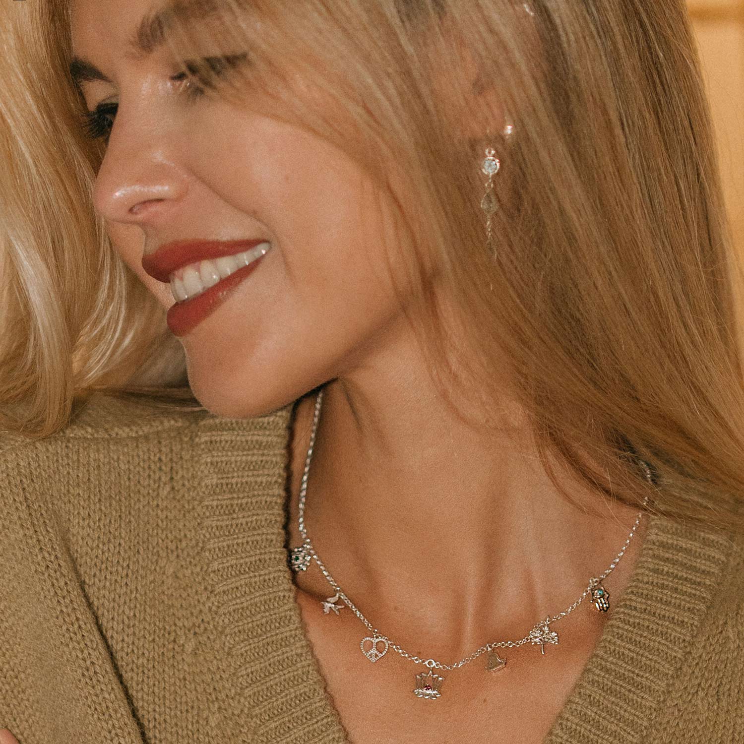 Ethically handmade, our Peace, Love & Freedom Charm Necklace inspires with its heart chakra charm, sitting Buddha charm, tree of life charm, lotus flower charm, swallow charm, Hamsa hand charm, and heart charm. Sustainable gemstones and silver make this the perfect fair trade necklace.